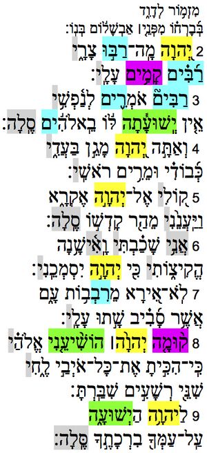 This text manifest much sonic correspondence, including semantic symbolism (e.g., “rise up”— enemies, 1b, versus Yahweh, 7a), frequent rhyme patterns (e.g., formed by the pronominal suffix "me/my", e.g., v. 2) and an irregular but audible lineal rhythmic flow.