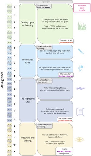 The macrostructure of the poem is key to understanding its message. Psalm 37 consists of four sections. The sections can be delimited based on the similarity of their beginnings and endings.