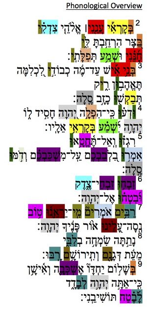 - vv.2, 4: a (בְּקָרְאִ֡י) b (וּשְׁמַ֥ע) c (ְּתְּפִלָּתִֽי) c' (הִפְלָ֣ה) b' (ִ֜שְׁמַ֗ע) a' (בְּקָרְאִ֥י)