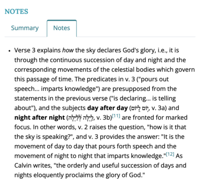 In the notes part of the page, you’ll find notes for each section, subsection, and verse. For each verse you’ll see the Hebrew and translation at the top, with a link to the grammatical diagram and an option to expand the expanded paraphrase. Beneath this, we organize our notes into three parts: summaries, notes, and footnotes.