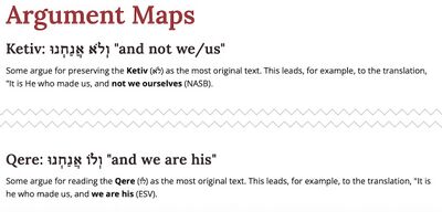 Each argument map corresponds to one interpretation of the exegetical issue. For Ps 100:3 there are two argument maps, one representing the “not we/us” interpretation (known as the Ketiv"The Aramaic terms כְּתִיב ketiv 'written' and קְרֵי qere 'read' are used in the medieval Tiberian Masoretic sources to refer, respectively, to the biblical consonantal text and the reading tradition reflected by the vocalization signs" (Kahn 2013). In other words, there will be a reported difference between the consonantal text and how the Masoretic scribes suggest the text should be pronounced out loud in synagogue, according to their historical reading tradition. For a detailed list of different variations in Ketiv/Qere differences see Gordis 1971, 82-158. argument), and one representing the “we are his” interpretation (the Qere argument). Each argument map has a brief prose introduction above the argument map.