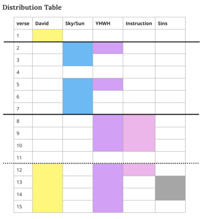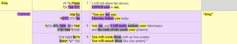 - The background of the text is colored according to the color of the speaker. Sometimes, a participant quotes another participant. These quotations are called embedded speech, and in these cases only the middle columns in the participant table change color (not the speaker column!). For example, in this example from Psalm 2 below, the king quotes YHWH, and the speaker column stays yellow (the king's color), but the middle columns become purple (YHWH's color).
