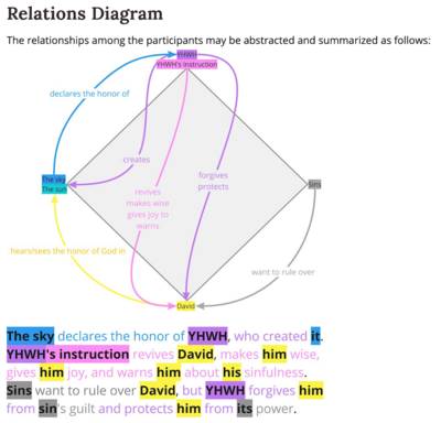 - ↑ A participant is an “agent, individual or corporate, who plays a unique relational role in the story of the psalm” (working definition). The main feature here is agency. In the psalms there are many inanimate referents that become participants when ascribed with agency (usually by becoming the subject of a verb). In Ps 98, for example, the sea roars, the rivers clap their hands, and the mountains sing before YHWH. They are all agentive subjects of verbs, and have a participant relationship with YHWH, and are therefore considered participants. However, in other psalms, these same referents are not agentive, and therefore not participants (e.g. Ps. 146 "YHWH...made the sea").