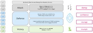 All the different features of the At-a-Glance visual are presented and explained in the Structure part of the Overview page. What is important to focus on here is the arrangement into sections and sub-sections. Take for example the At-a-Glance for Psalm 3. You can see here the three main sections (1-3 Attack | 4-7 Defense | 8-9 Victory), with the middle section Attack divided into two subsections (4-5 | 6-7).