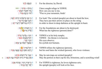 | יְהוָה֮ צַדִּ֪יק יִ֫בְחָ֥ן וְ֭רָשָׁע | "The LORD examines both the righteous and the wicked. |