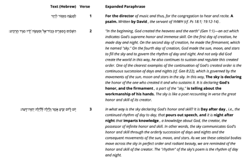 The third view is our Expanded Paraphrase, taken from our Story Behind the Psalm layer. This aims to bring out the full story of the psalm by filling in key implied information “between the lines” - the actual text of the psalm is presented in bold, and the implied added information is in italics. For more details on this view you can explore the Story Behind the Psalm page.