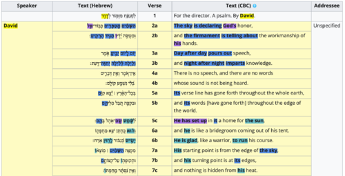 The fourth view is our Participant Tracking Text, which tracks each participant included in the psalm, represented by a different highlight color. This covers both the speaker and addressee, as well as the specific participants referenced throughout the text itself. You can explore more information and explanatory notes on this view in our Participant Analysis layer.