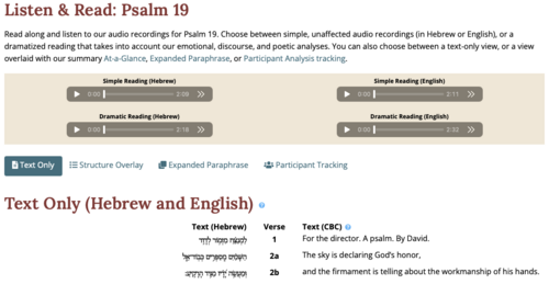 The Text Page has two sections: an audio player where you can hear and download 4 different recordings of the psalm, and a text section where you can read the psalm in Hebrew and English, in multiple layouts taken from our different layers of analysis.
