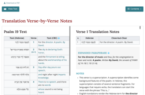 On this page you can press “View Text” to open and close the text. The notes are on the right. In the text view you can also press any verse to jump to the notes for that verse, and press any words in blue to jump to the notes for those words. For a walkthrough of the similarities and differences between the Translation Notes and the Verse by Verse notes, see the Explainer Video above.