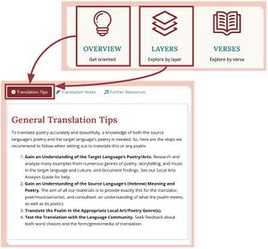 As the arrows in the image to the right show, the resources for the Translation Tips are taken mostly from our Layer by Layer resources as well as the psalm Overview page. This page is made up of 7 tabs covering key information which any translator should keep in mind for this psalm. In translation, verse by verse accuracy is important, but it is just as important to create a translation that is faithful to the psalm as whole. In each tab we reorganize the resources from our layers and overview page into brief presentations. If users wish to explore any of the materials in more depth, links are provided to the corresponding pages in the rest of our resources.